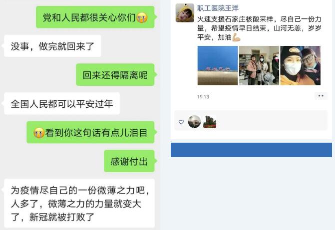 陳思宇是一名職工醫(yī)院的護(hù)士,團(tuán)支部書記,同時也是共產(chǎn)黨員,業(yè)務(wù)能力強(qiáng),責(zé)任心強(qiáng),接到通知后,她表示堅(jiān)決服從組織安排。“唯一有些顧慮的就是孩子還小,從來沒有離開過媽媽。但是家里孩子的奶奶爺爺、姥姥姥爺非常支持,覺得這是一件非常有意義的事兒,他們一定會好好照顧孩子,全家人的支持把我的顧慮都解決了。然后我就特別灑脫的坐上了去石家莊支援的車?!标愃加钚χf。